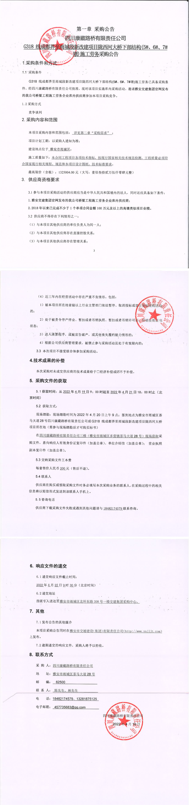 四川康藏路橋有限責任公司G318線成都界至雨城段新改建項目隴西河大橋下部結(jié)構(gòu)(5#、6#、7#墩)施工勞務采購公告