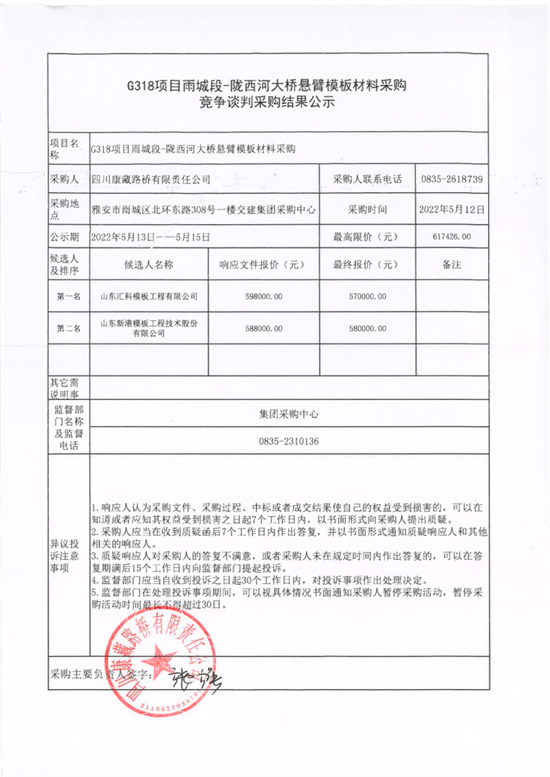 四川康藏路橋有限責(zé)任公司G318項目雨城段-隴西河大橋懸臂模板材料采購競爭談判采購結(jié)果公示