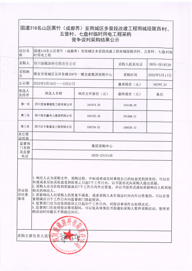 四川康藏路橋有限責(zé)任公司國道318名山區(qū)黑竹(成都界)至雨城區(qū)多營段改建工程雨城段隴西村、五營村、七盤村臨時(shí)用電工程采購競(jìng)爭(zhēng)談判結(jié)果公示