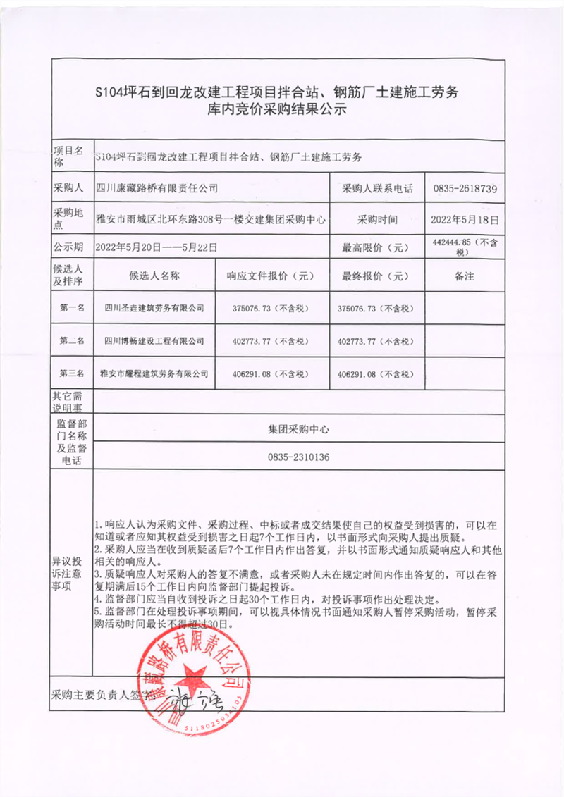 四川康藏路橋有限責(zé)任公司S104坪石到回龍改建工程項(xiàng)目拌合站、鋼筋廠土建施工勞務(wù)庫(kù)內(nèi)競(jìng)價(jià)采購(gòu)結(jié)果公示