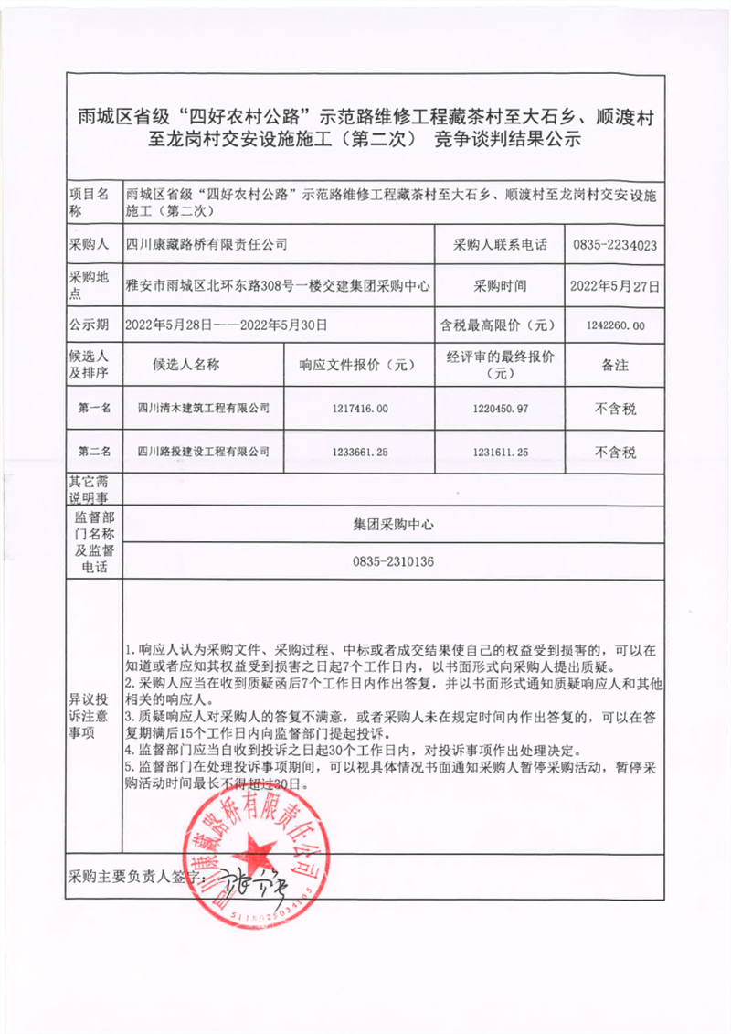 四川康藏路橋有限責任公司雨城區(qū)省級“四好農(nóng)村公路”示范路維修工程藏茶村至大石鄉(xiāng)、順渡村至龍崗村交安設(shè)施施工(第二次)競爭談判結(jié)果公示