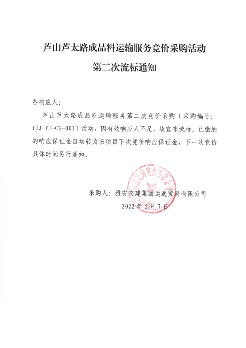 雅安交建集團(tuán)運(yùn)通貿(mào)易有限公司蘆山蘆太路成品料運(yùn)輸服務(wù)競價(jià)采購活動(dòng)第二次流標(biāo)通知