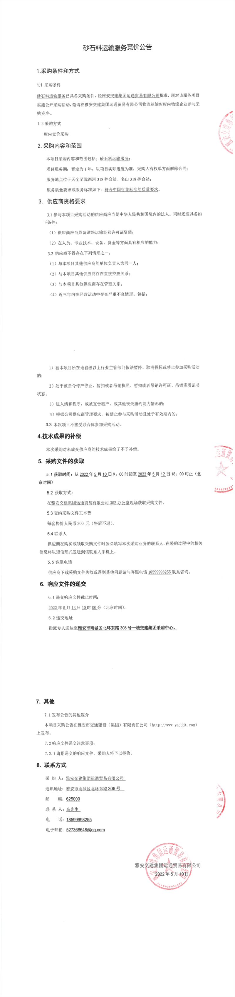 雅安交建集團運通貿(mào)易有限公司砂石料運輸服務(wù)競價公告