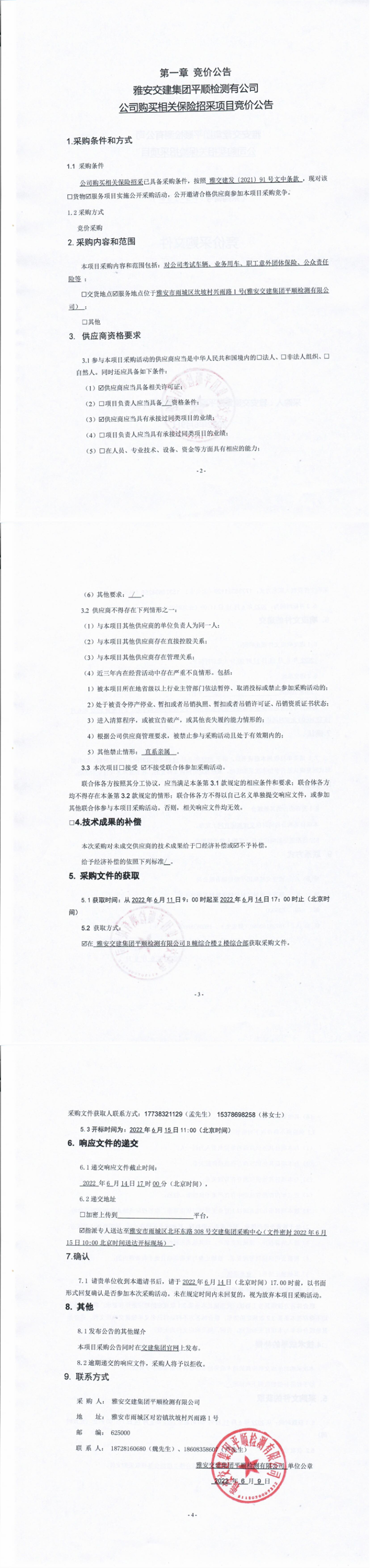 雅安交建集團平順檢測有限公司公司購買相關保險招采項目競價公告