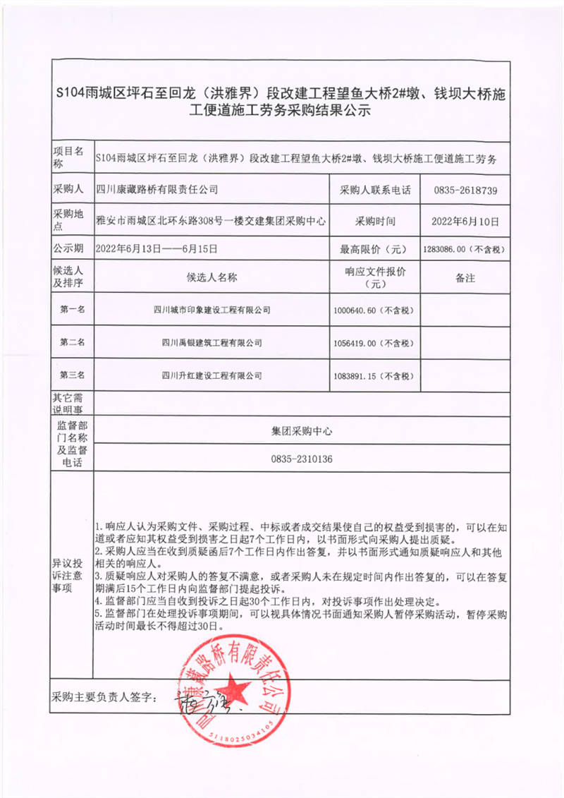 四川康藏路橋有限責任公司S104雨城區(qū)坪石至回龍(洪雅界)段改建工程望魚大橋2#墩、錢壩大橋施工便道施工勞務采購結果公示