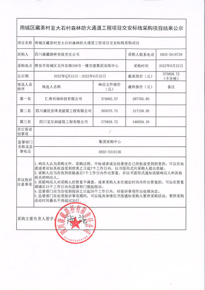 四川康藏路橋有限責(zé)任公司雨城區(qū)藏茶村至大石村森林防火通道工程項(xiàng)目交安標(biāo)線采購項(xiàng)目結(jié)果公示