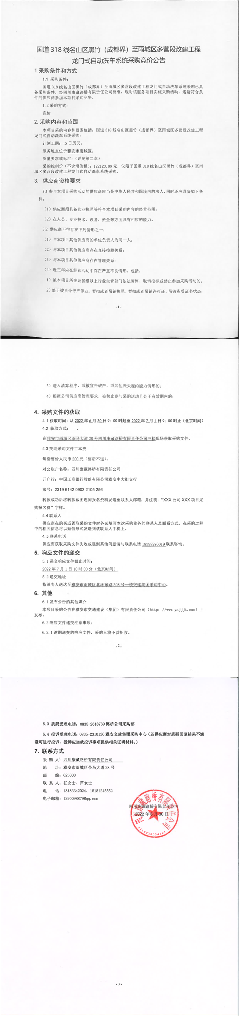 四川康藏路橋有限責(zé)任公司國道318名山區(qū)黑竹(成都界)至雨城區(qū)多營段改建工程龍門式自動洗車系統(tǒng)采購競價(jià)公告