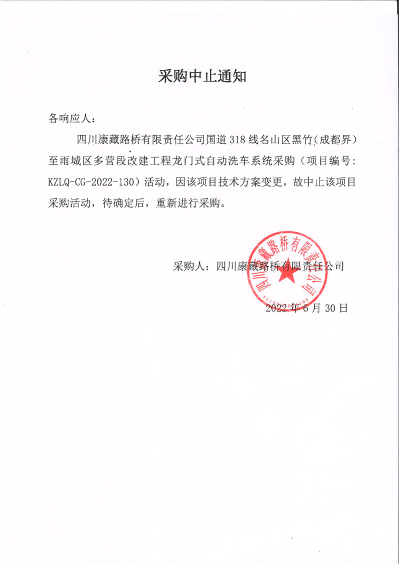 四川康藏路橋有限責(zé)任公司國道318線名山區(qū)黑竹(成都界)至雨城區(qū)多營段改建工程龍門式自動洗車系統(tǒng)采購中止通知
