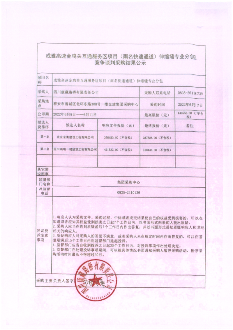 四川康藏路橋有限責任公司成雅高速金雞關(guān)互通服務區(qū)項目(雨名快速通道)伸縮縫工程專業(yè)分包競爭談判采購結(jié)果公示