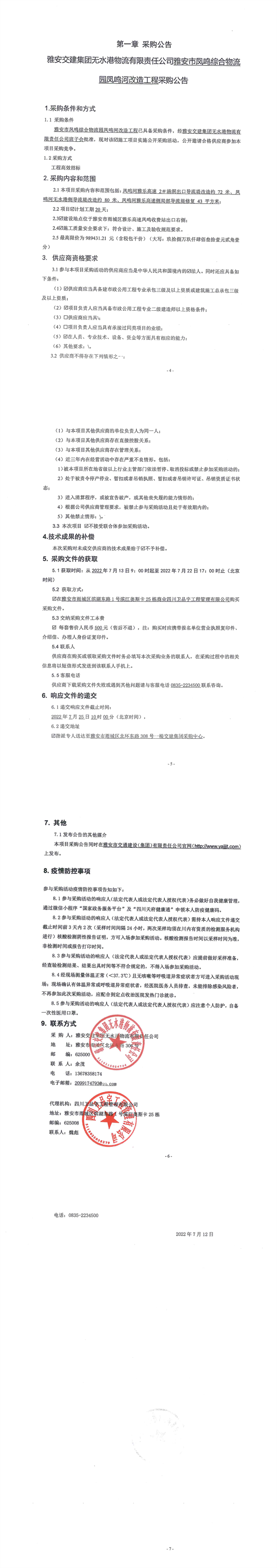雅安交建集團(tuán)無水港物流有限責(zé)任公司雅安市鳳鳴綜合物流園鳳鳴河改造工程采購公告