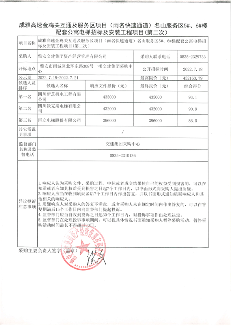 雅安交建集團資產(chǎn)經(jīng)營管理有限公司成雅高速金雞關(guān)互通及服務(wù)區(qū)項目(雨名快速通道)名山服務(wù)區(qū)5#、6#樓配套公寓電梯招標(biāo)及安裝工程項目招標(biāo)公告(第二次)結(jié)果公示