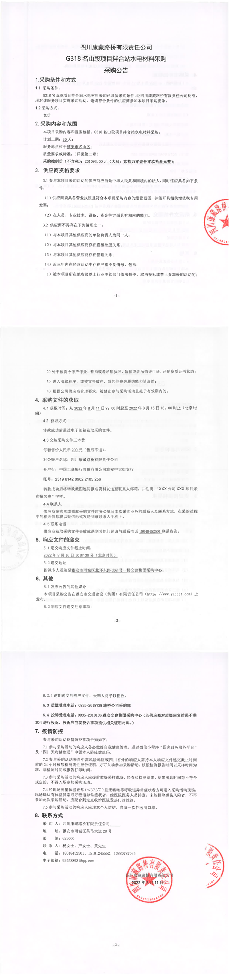 四川康藏路橋有限責(zé)任公司G318名山段項(xiàng)目拌合站水電材料采購采購公告