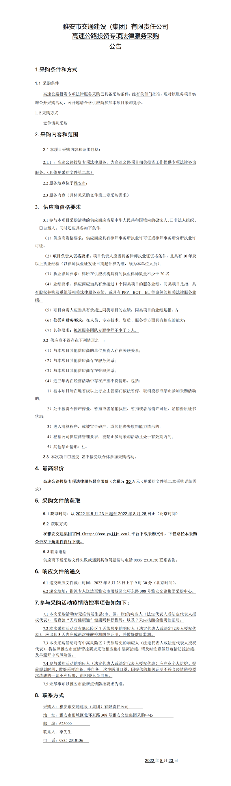 雅安市交通建設(shè)(集團(tuán))有限責(zé)任公司高速公路投資專(zhuān)項(xiàng)法律服務(wù)采購(gòu)公告