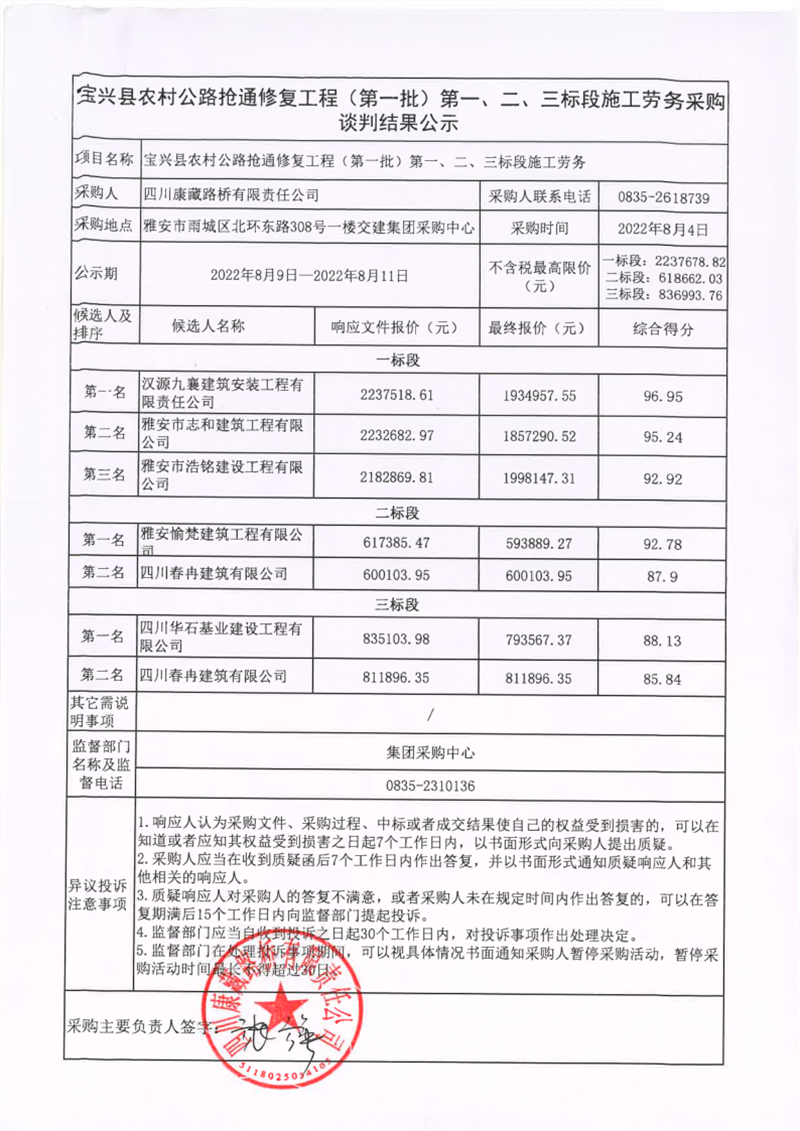 四川康藏路橋有限責(zé)任公司寶興縣農(nóng)材公路搶通修復(fù)工程(第一批)第一、二、三標(biāo)段施工勞務(wù)談判結(jié)果公示