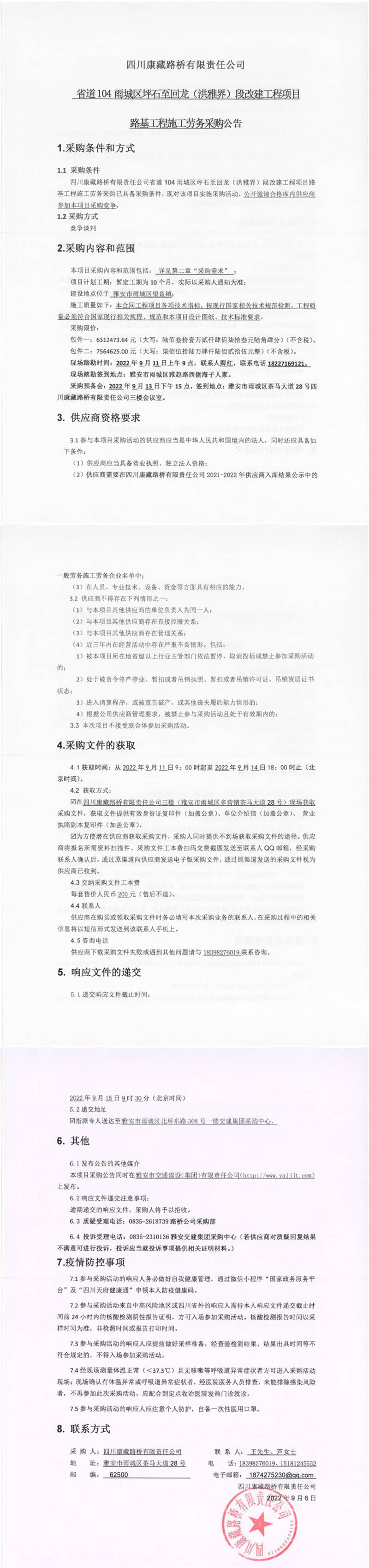 四川康藏路橋有限責(zé)任公司省道104雨城區(qū)坪石至回龍(洪雅界)段改建工程項(xiàng)目路基工程施工勞務(wù)采購(gòu)公告