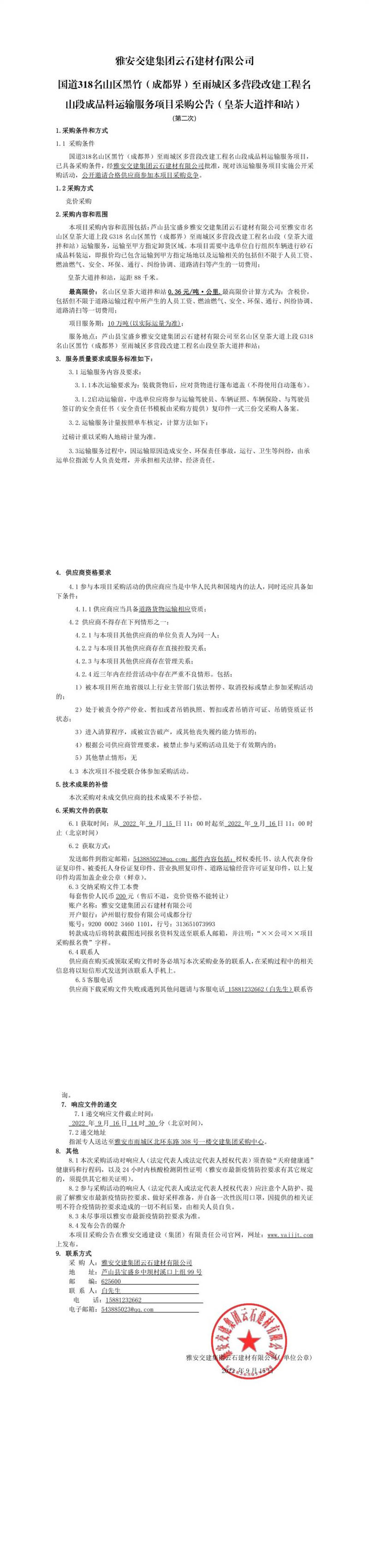 雅安交建集團云石建材有限公司國道318名山區(qū)黑竹(成都界)至雨城區(qū)多營段改建工程名山段成品料運輸服務項目采購公告(皇茶大道拌和站)