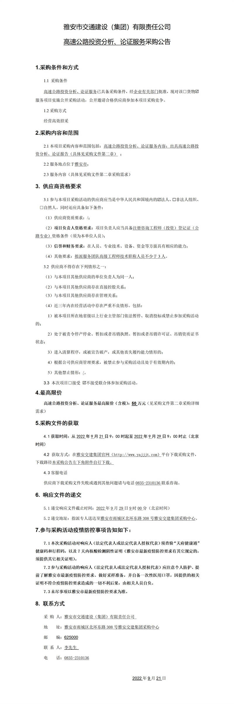 雅安市交通建設(shè)(集團(tuán))有限責(zé)任公司高速公路投資分析、論證服務(wù)采購公告
