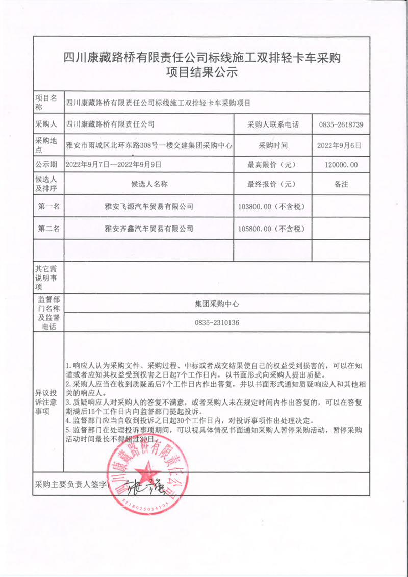 四川康藏路橋有限責(zé)任公司標(biāo)線施工雙排輕卡車采購項目結(jié)果公示