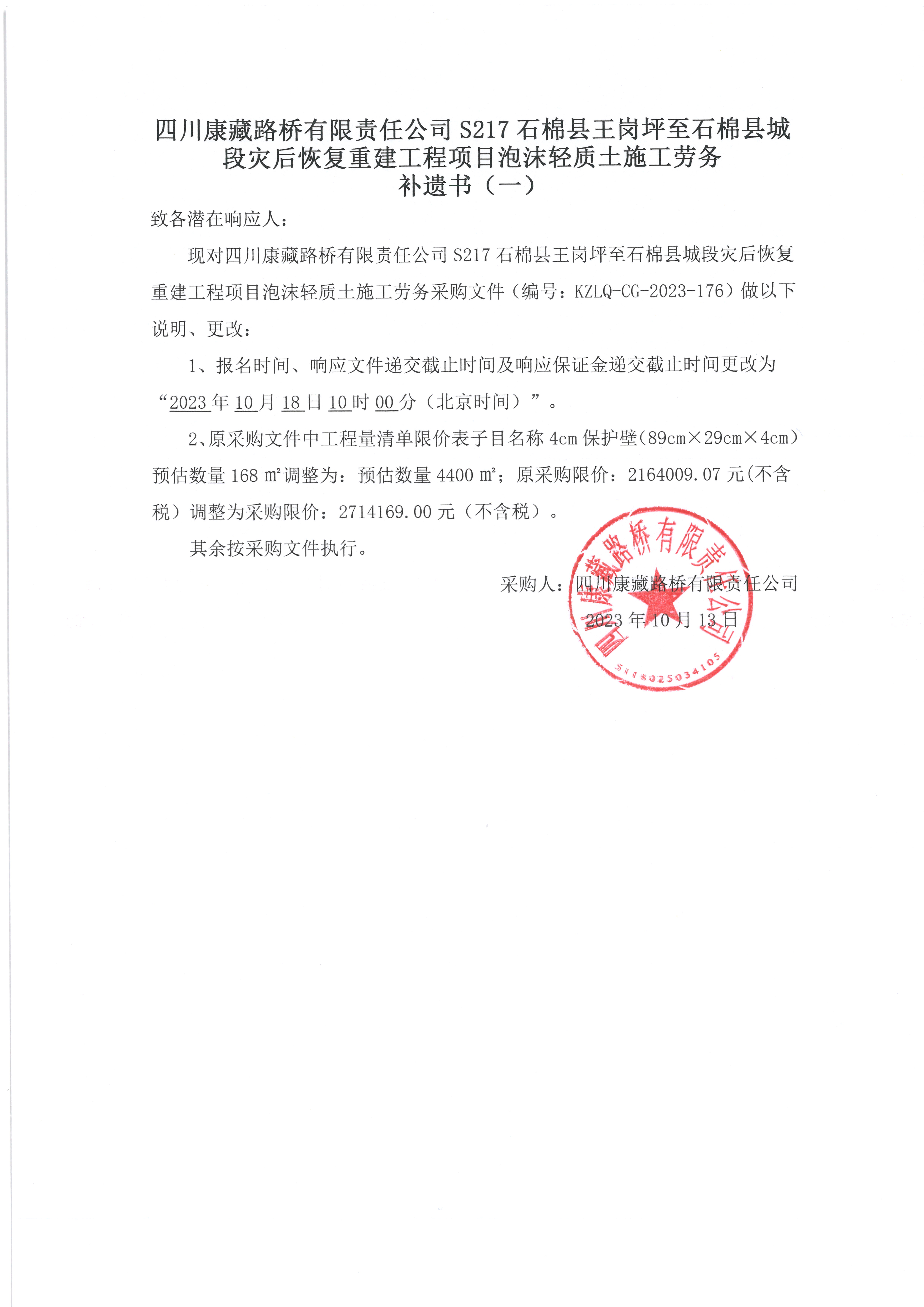 四川康藏路橋有限責(zé)任公司S217石棉縣王崗坪至石棉縣城段災(zāi)后恢復(fù)重建工程項(xiàng)目泡沫輕質(zhì)土施工勞務(wù)補(bǔ)遺書(一)