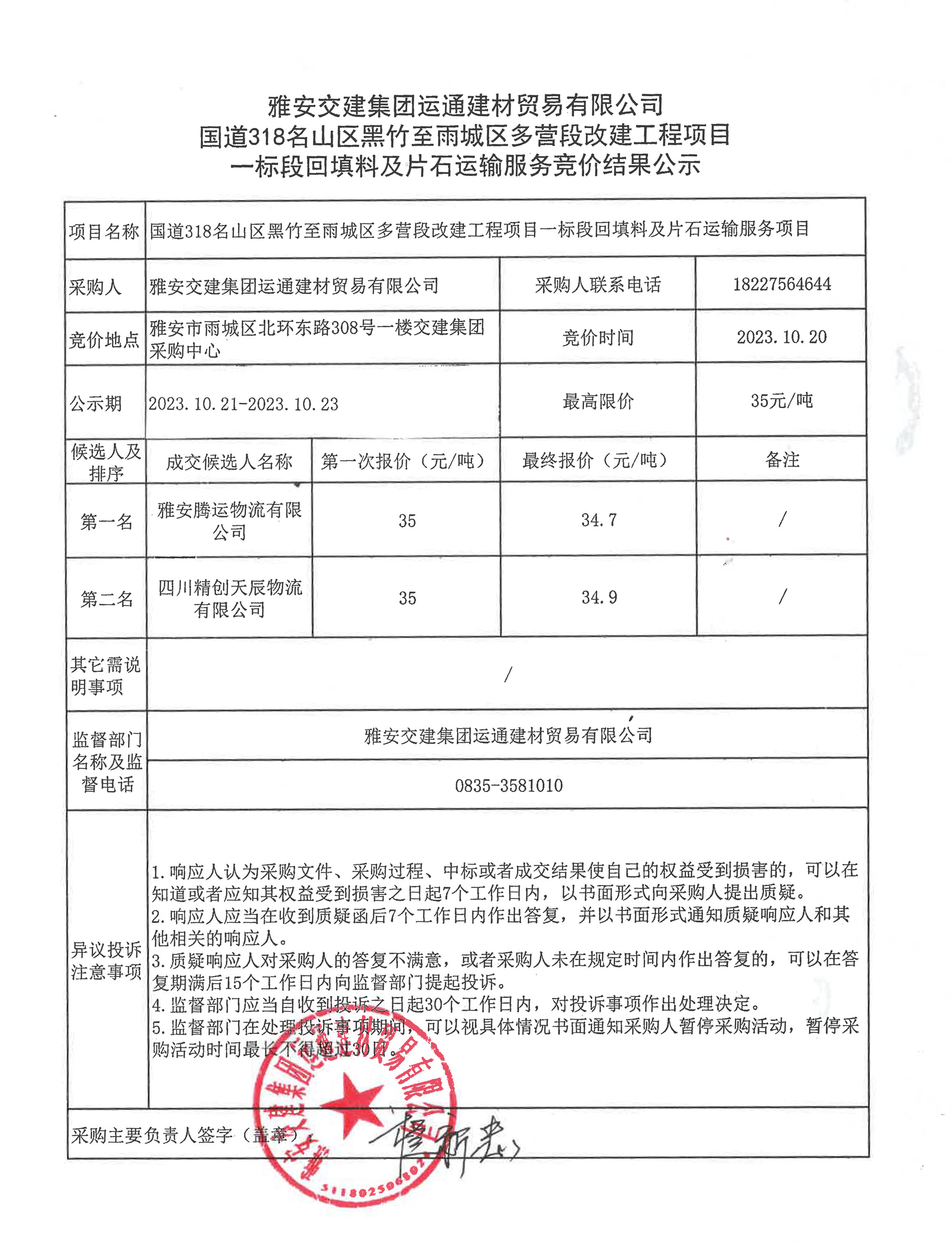 雅安交建集團運通建材貿易有限公司 國道318名山區(qū)黑竹至雨城區(qū)多營段改建工程項目一標段回填料及片石運輸服務競價結果公示