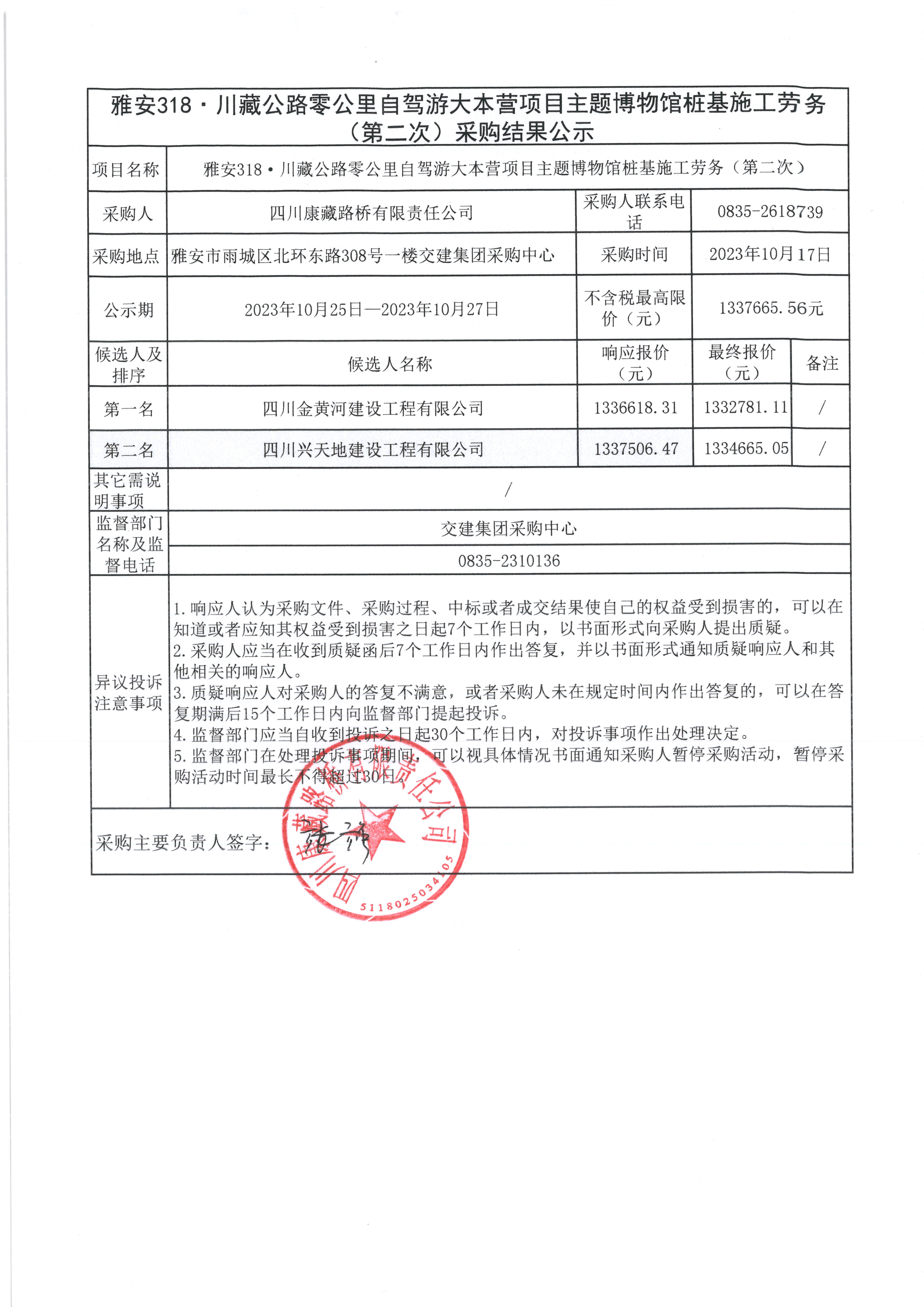 四川康藏路橋有限責任公司雅安318·川藏公路零公里自駕游大本營項目主題博物館樁基施工勞務(wù)(第二次)采購結(jié)果公示