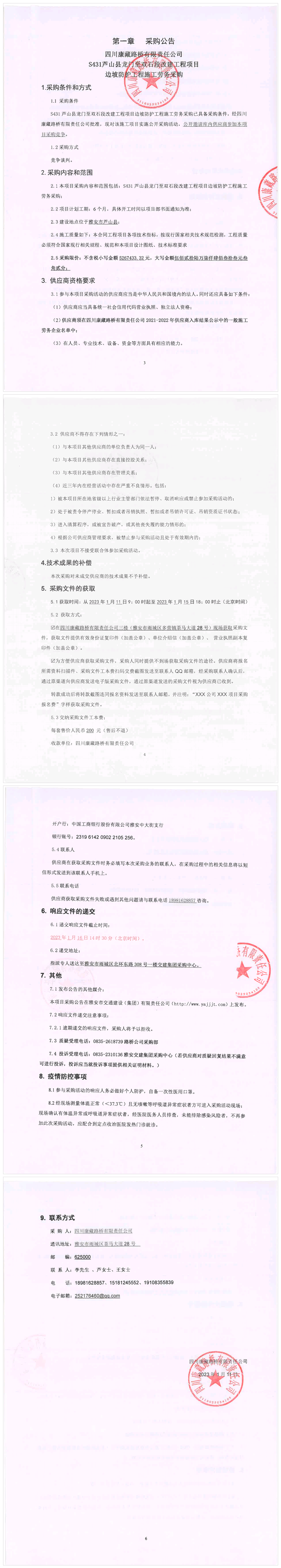 四川康藏路橋有限責(zé)任公司S431蘆山縣龍門(mén)至雙石段改建工程項(xiàng)目邊坡防護(hù)工程施工勞務(wù)采購(gòu)公告