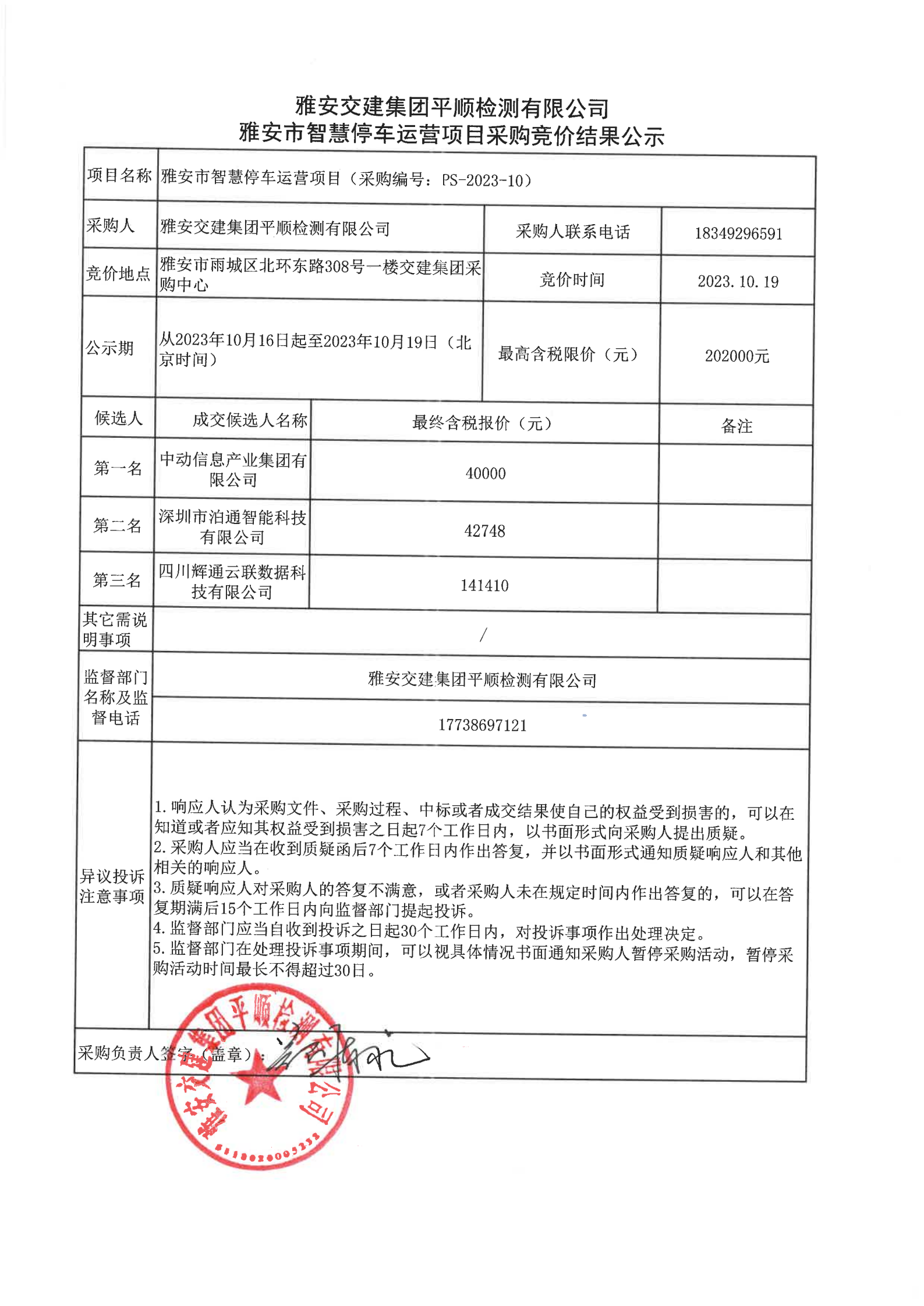 雅安交建集團平順檢測有限公司雅安市智慧停車運營項目采購競價結果公示