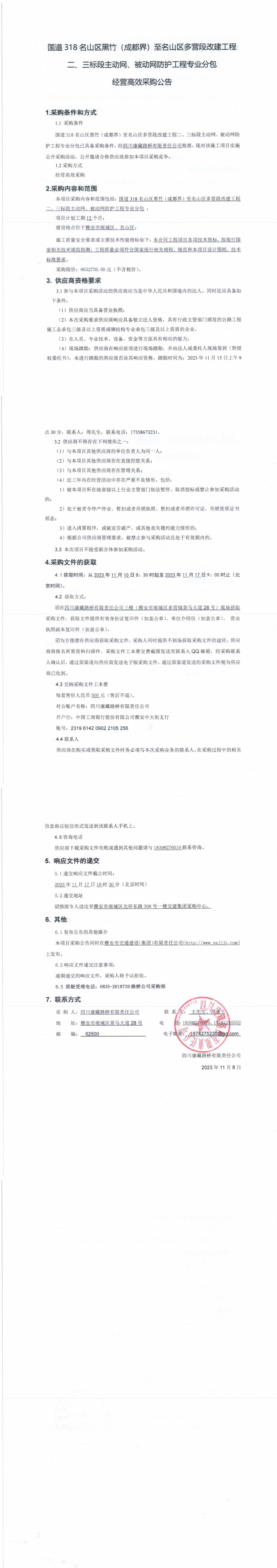 四川康藏路橋有限責(zé)任公司國(guó)道318名山區(qū)黑竹(成都界)至名山區(qū)多營(yíng)段改建工程二、三標(biāo)段主動(dòng)網(wǎng)、被動(dòng)網(wǎng)防護(hù)工程專(zhuān)業(yè)分包經(jīng)營(yíng)高效采購(gòu)公告