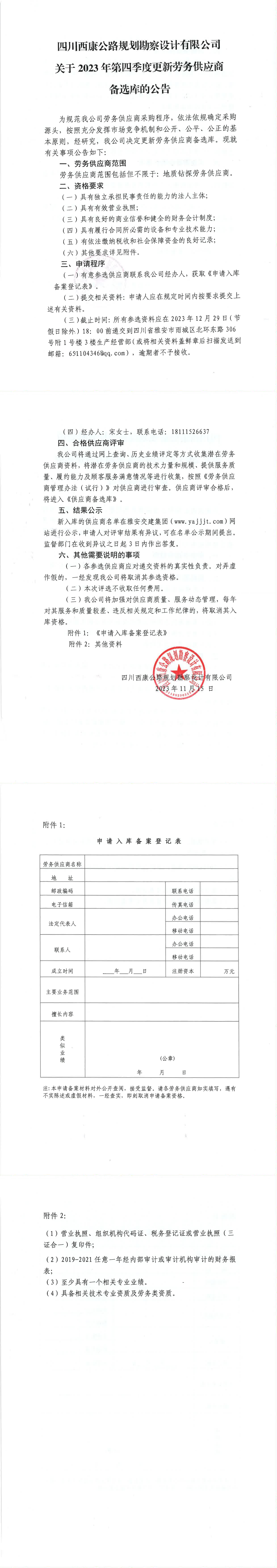 四川西康公路規(guī)劃勘察設(shè)計有限公司關(guān)于2023年第四季度更新勞務(wù)供應(yīng)商備選庫的公告