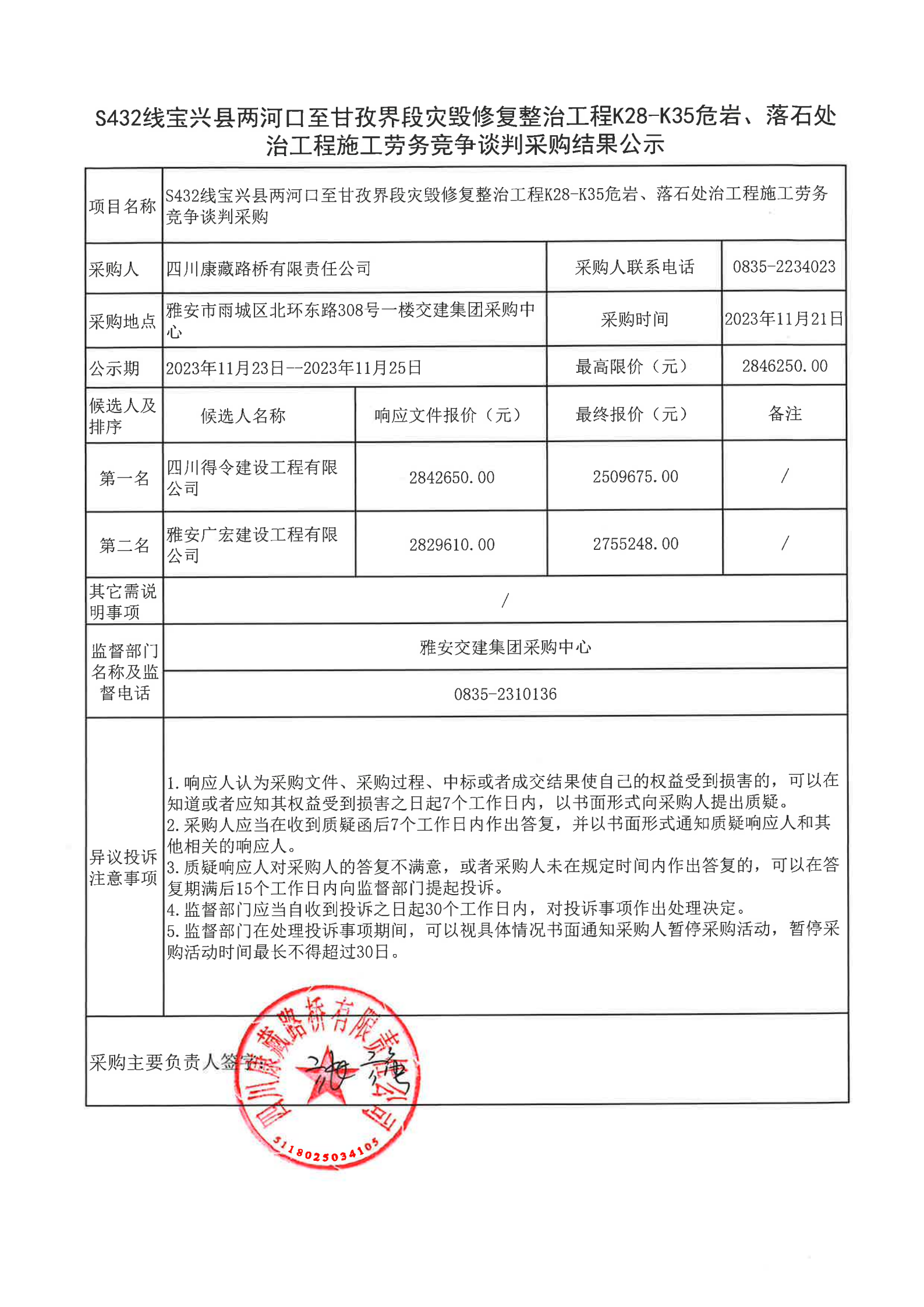 四川康藏路橋有限責任公司S432線寶興縣兩河口至甘孜界段災毀修復整治工程K28-K35危巖、落石處治工程施工勞務(wù)競爭談判采購結(jié)果公示