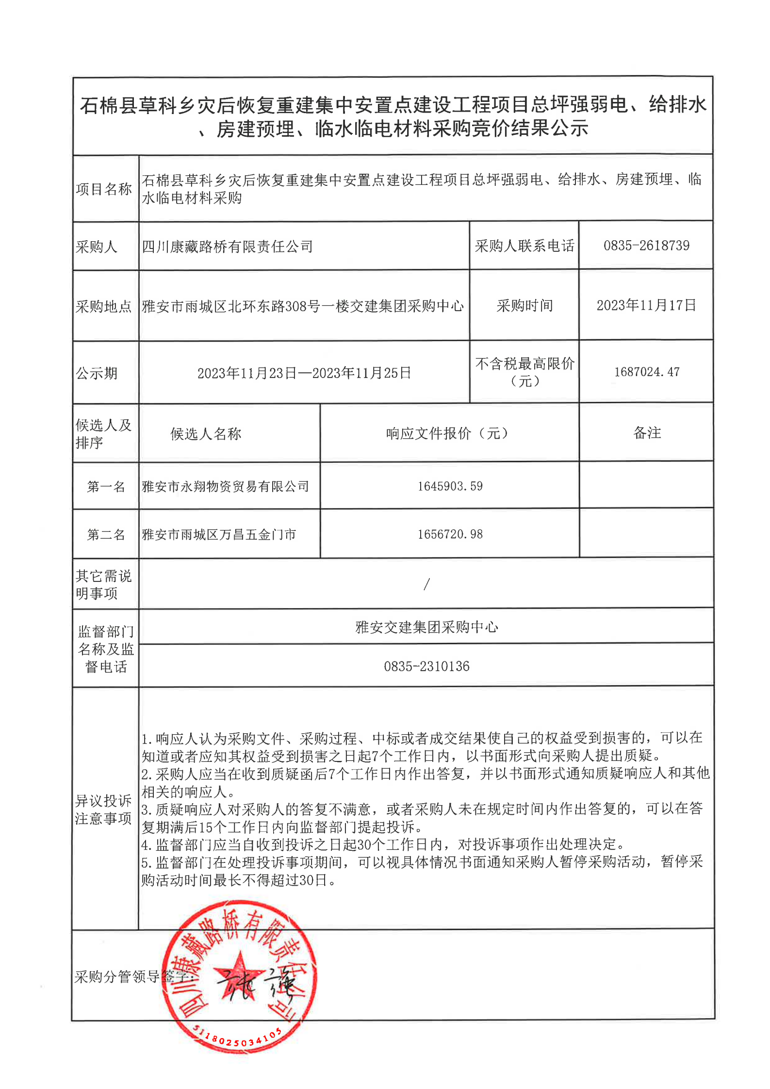 四川康藏路橋有限責任公司石棉縣草科鄉(xiāng)災后恢復重建集中安置點建設工程項目總坪強弱電、給排水、房建預埋、臨水臨電材料采購結果公示