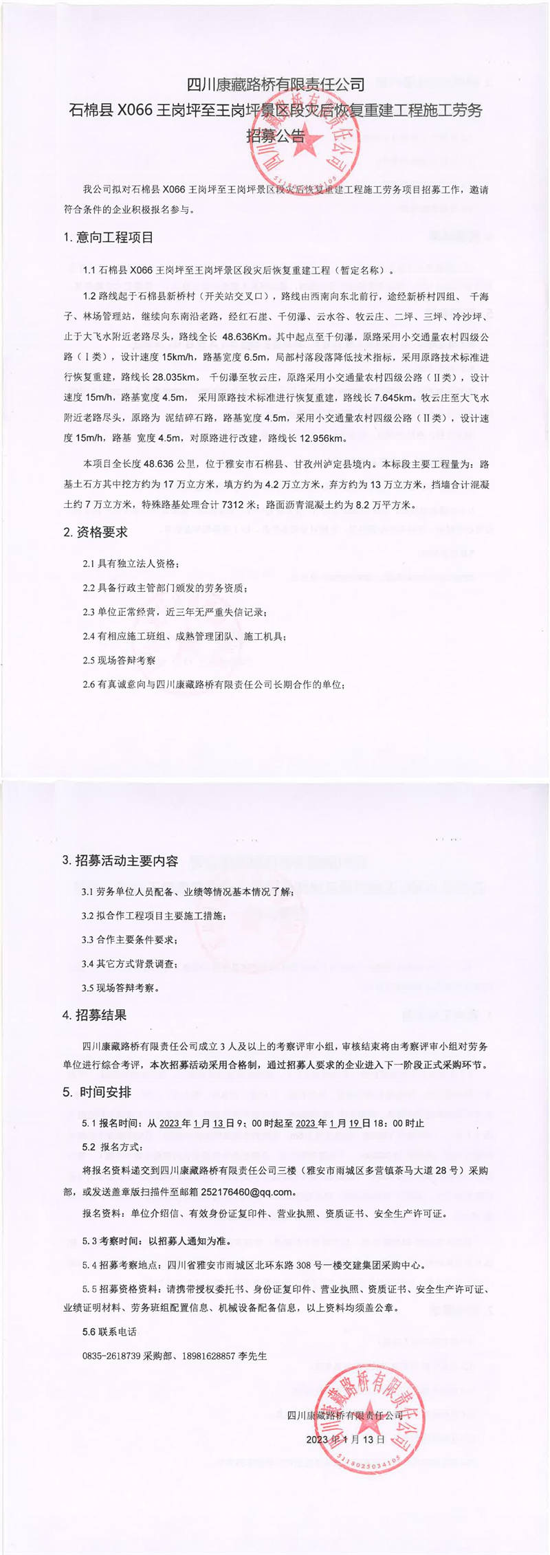 四川康藏路橋有限責任公司石棉縣X066王崗坪至王崗坪景區(qū)段災后恢復重建工程施工勞務招募公告