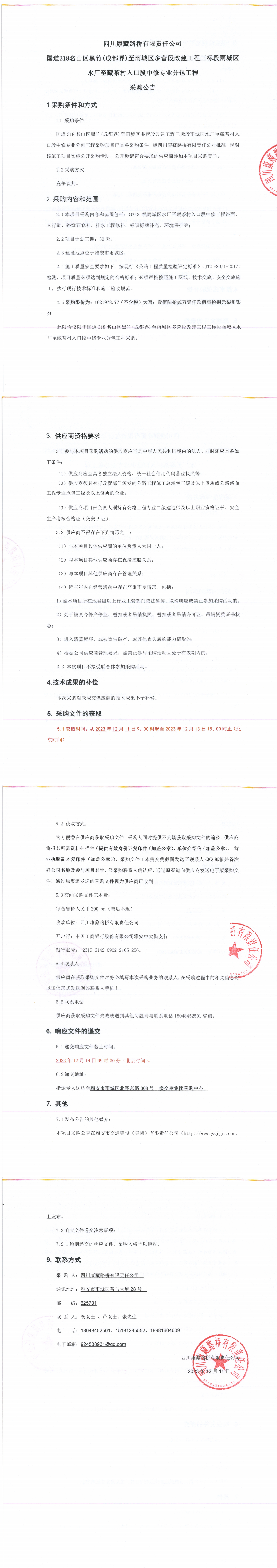 四川康藏路橋有限責任公司國道318名山區(qū)黑竹(成都界)至雨城區(qū)多營段改建工程三標段雨城區(qū)水廠至藏茶村入口段中修專業(yè)分包工程采購公告
