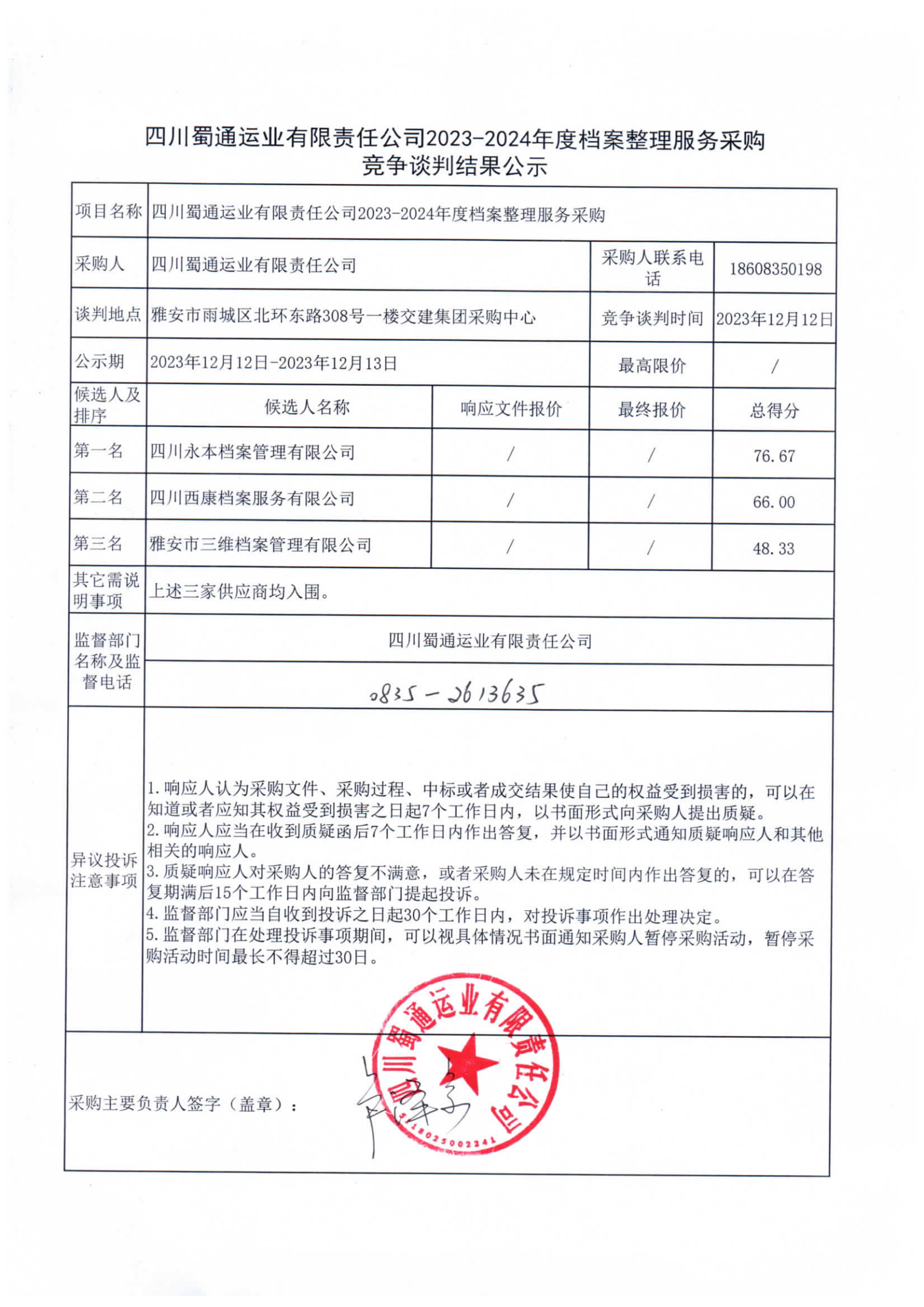 四川蜀通運業(yè)有限責任公司2023-2024年度檔案整理服務采購競爭談判結果公示