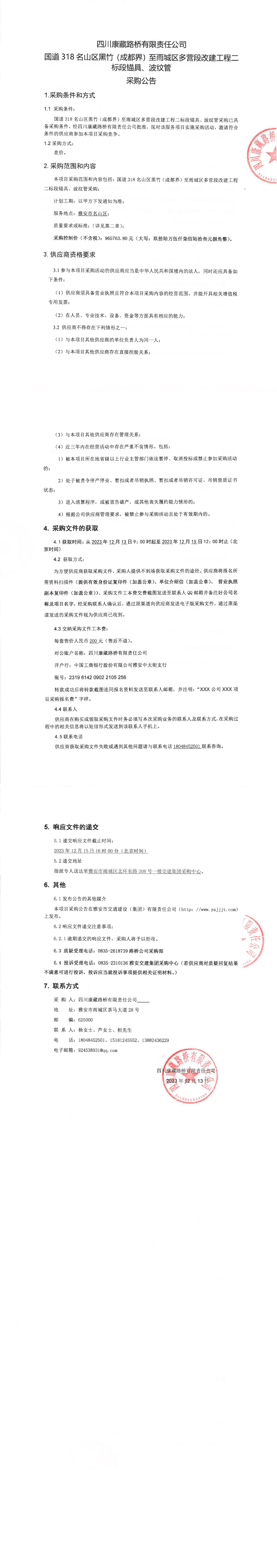 四川康藏路橋有限責(zé)任公司國(guó)道318名山區(qū)黑竹(成都界)至雨城區(qū)多營(yíng)段改建工程二標(biāo)段錨具、波紋管采購(gòu)公告