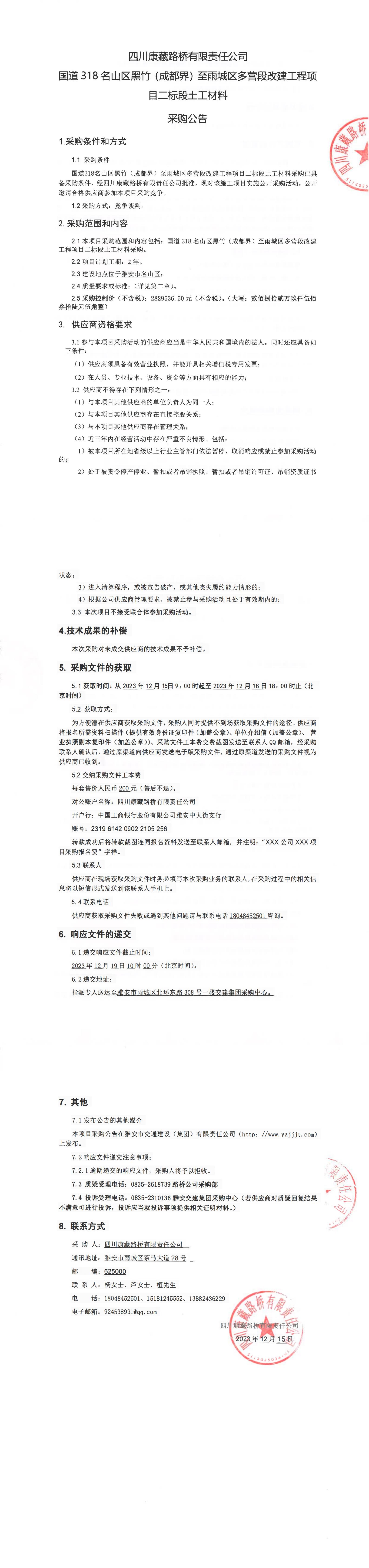 四川康藏路橋有限責任公司國道318名山區(qū)黑竹(成都界)至雨城區(qū)多營段改建工程項目二標段土工材料采購公告