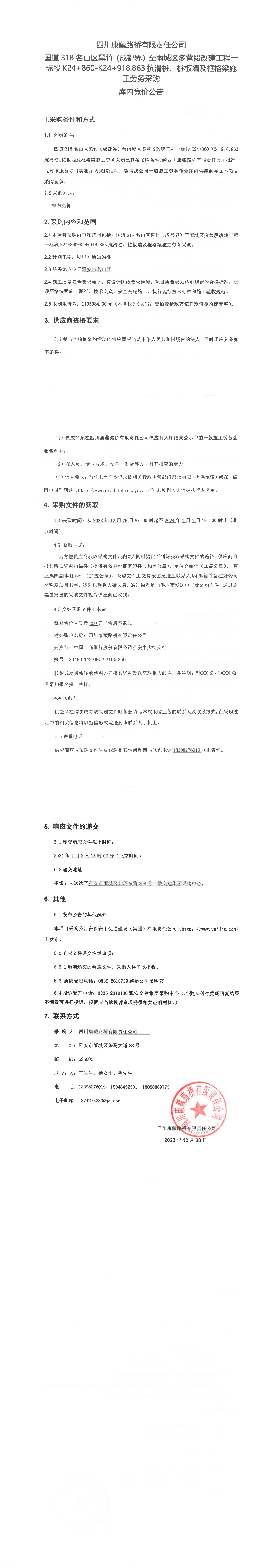 四川康藏路橋有限責(zé)任公司國道318名山區(qū)黑竹(成都界)至雨城區(qū)多營段改建工程一標(biāo)段K24+860-K24+918.863抗滑樁、樁板墻及框格梁施工勞務(wù)采購庫內(nèi)競價公告
