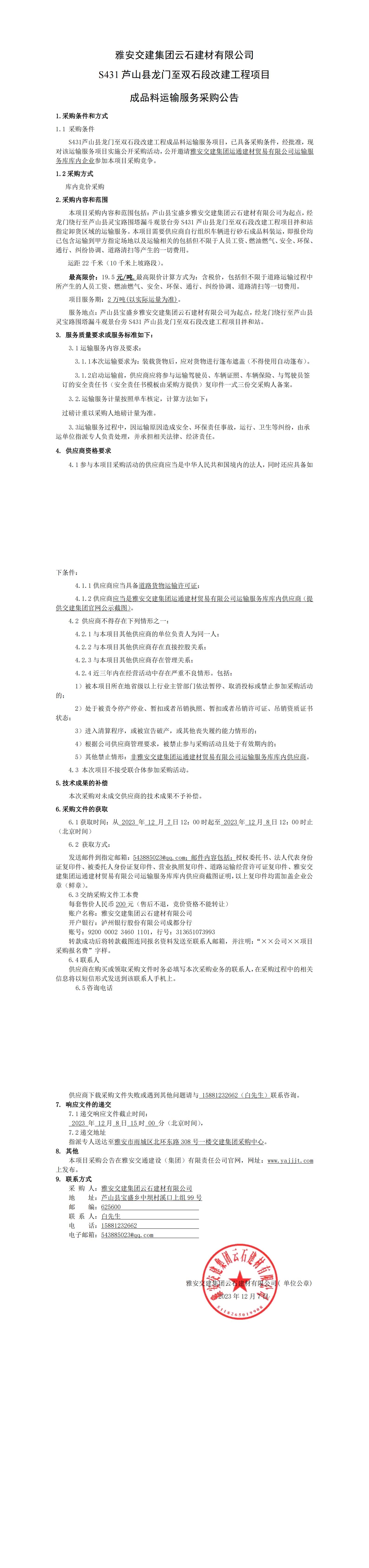 雅安交建集團(tuán)云石建材有限公司S431蘆山縣龍門至雙石段改建工程項目成品料運輸服務(wù)采購公告