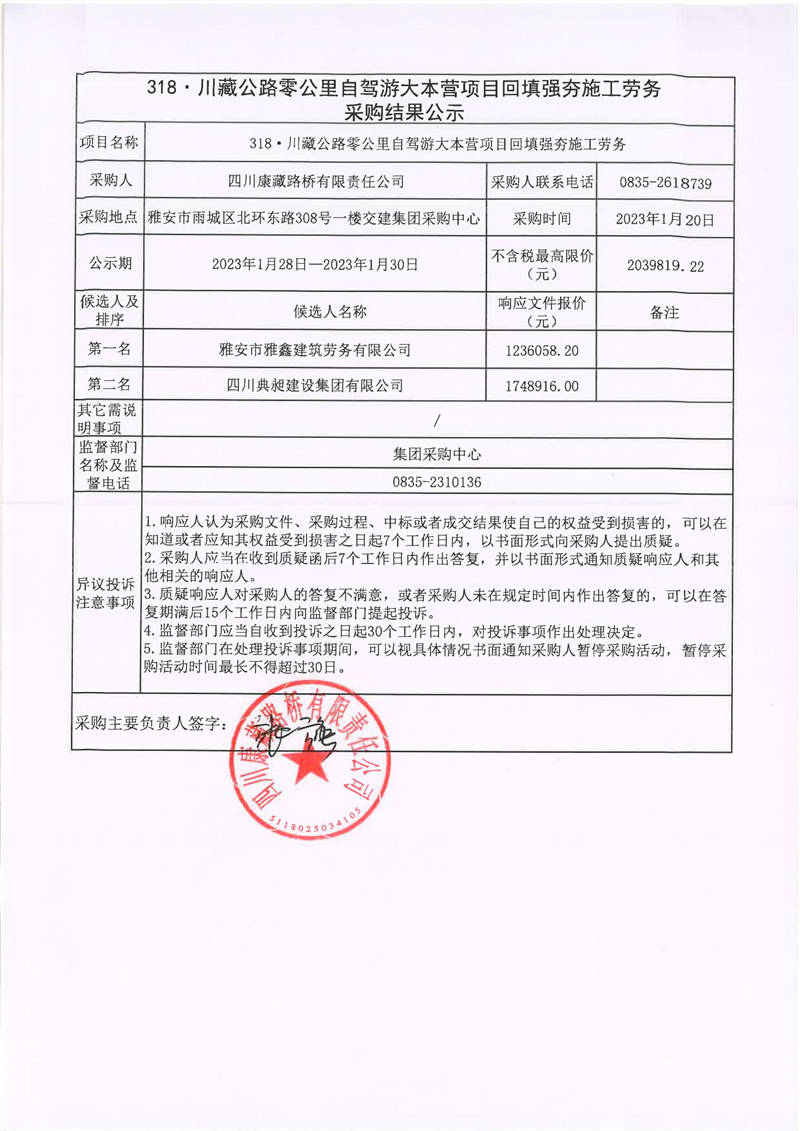 四川康藏路橋有限責(zé)任公司318.川藏公路零公里自駕游大本營項目回填強(qiáng)夯施工勞務(wù)采購結(jié)果公示