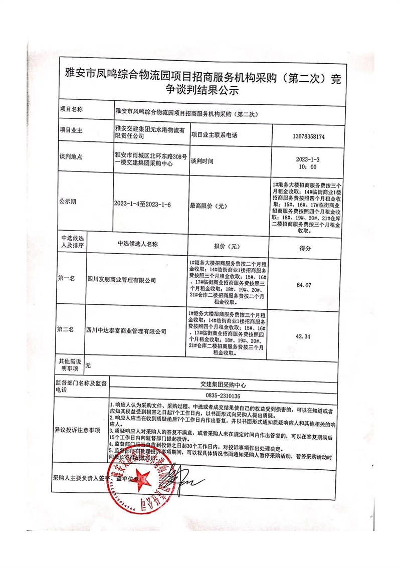 雅安交建集團(tuán)無水港物流有限責(zé)任公司雅安市鳳鳴綜合物流園項(xiàng)目招商服務(wù)機(jī)構(gòu)采購(第二次)競(jìng)爭(zhēng)談判結(jié)果公示