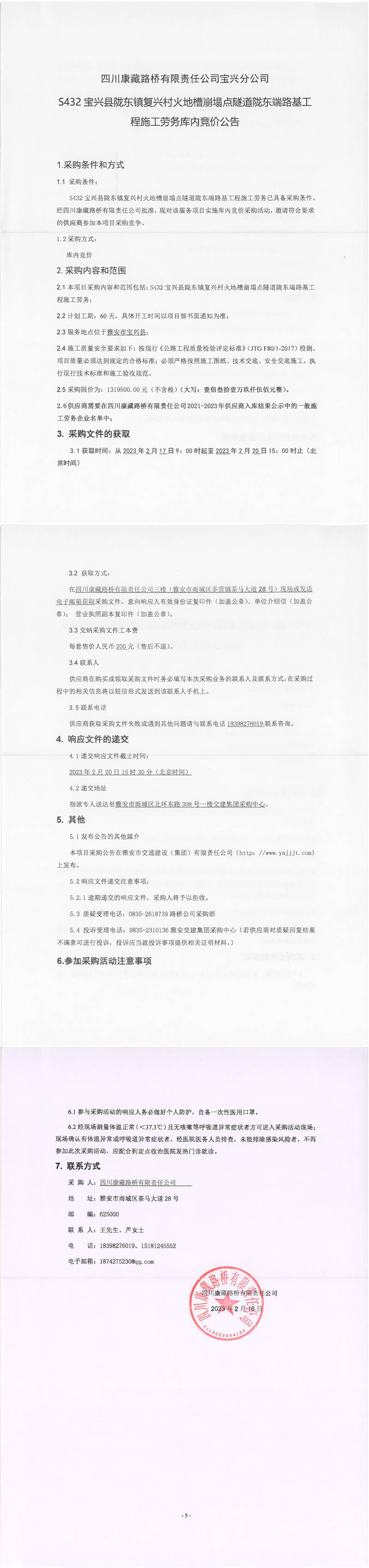 四川康藏路橋有限責(zé)任公司S432線寶興縣兩河口至甘孜界段災(zāi)毀修復(fù)整治工程項(xiàng)目五龍改線段(K4+300-K5+740)段施工勞務(wù)公告