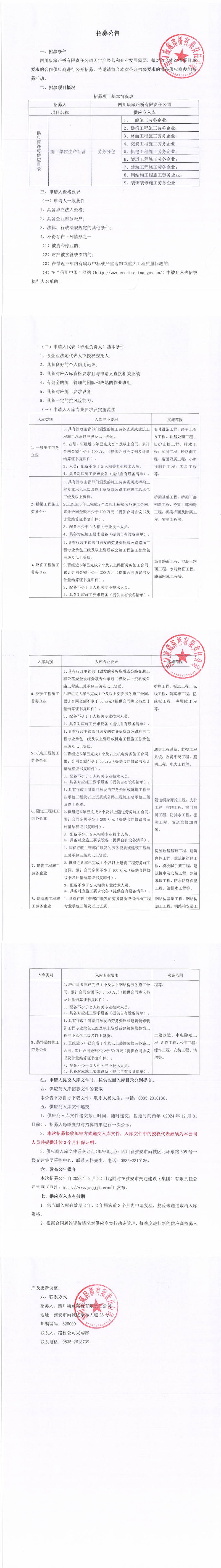 四川康藏路橋有限責(zé)任公司2023年供應(yīng)商入庫(kù)(施工單位生產(chǎn)經(jīng)營(yíng)勞務(wù)分包)招募公告