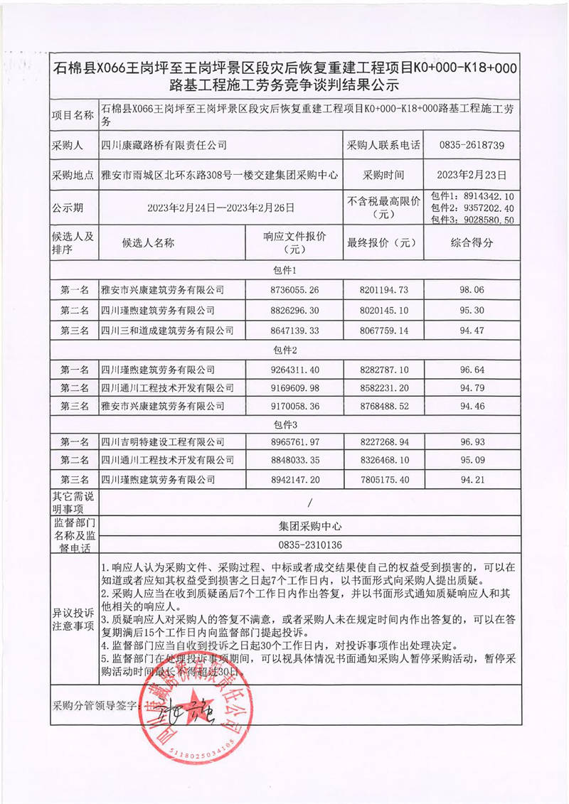 四川康藏路橋有限責任公司石棉縣X066王崗坪至王崗坪景區(qū)段災(zāi)后恢復(fù)重建工程項目K0+000-K18+000路基工程施工勞務(wù)競爭談判結(jié)果公示