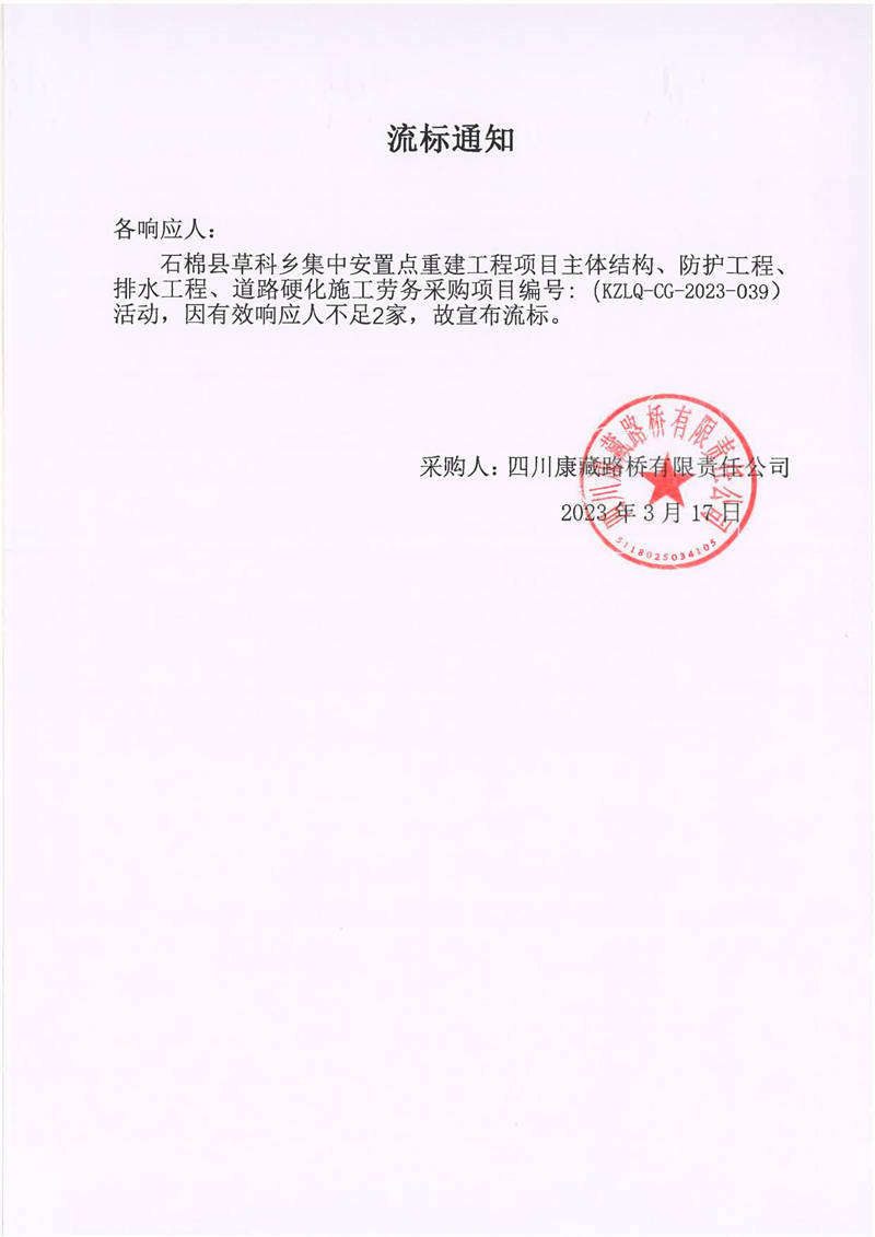 四川康藏路橋有限責(zé)任公司石棉草科鄉(xiāng)集中安置點(diǎn)重建工程項(xiàng)目主體結(jié)構(gòu)、防護(hù)工程、排水工程、道路硬化施工勞務(wù)采購流標(biāo)通知