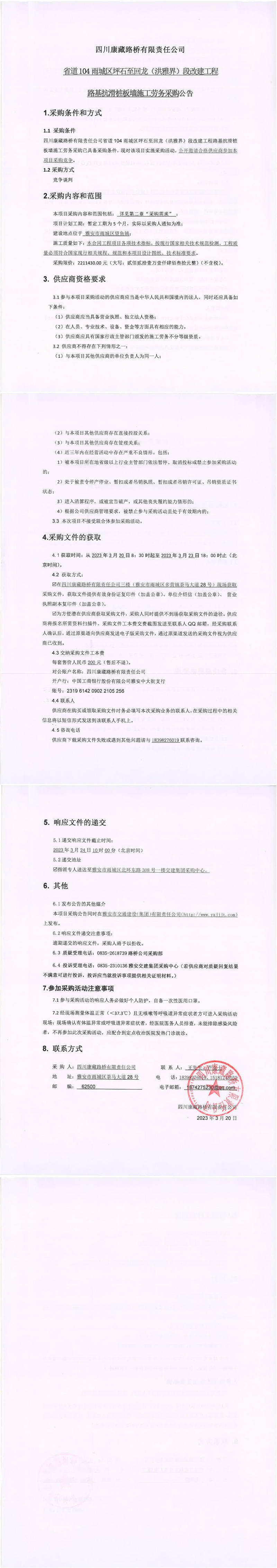 四川康藏路橋有限責(zé)任公司省道104雨城區(qū)坪石至回龍(洪雅界)段改建工程路基抗滑樁板墻施工勞務(wù)采購(gòu)公告