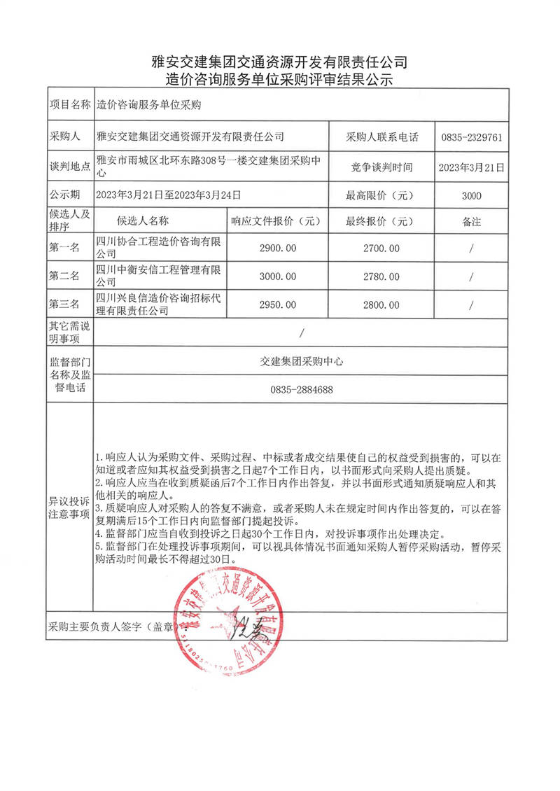 雅安交建集團交通資源開發(fā)有限責任公司造價咨詢服務單位采購評審結果公示