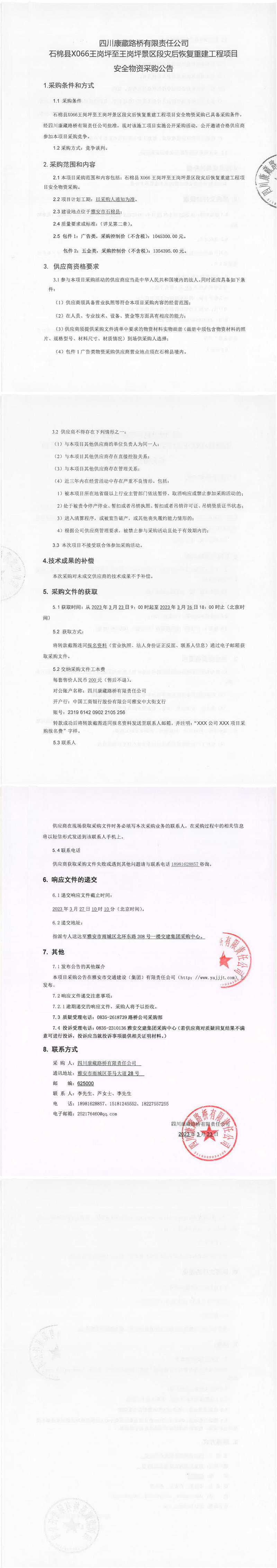 四川康藏路橋有限責(zé)任公司石棉縣X066王崗坪至王崗坪景區(qū)段災(zāi)后恢復(fù)重建工程項(xiàng)目安全物資采購(gòu)公告