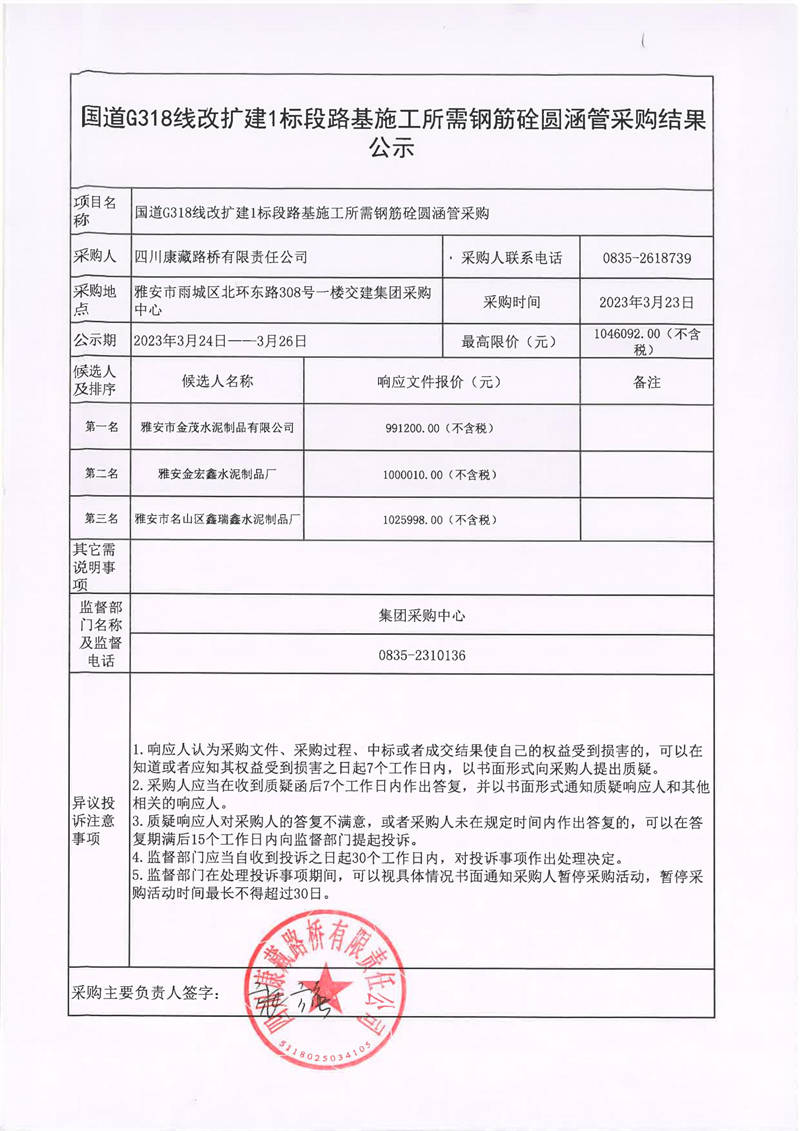 四川康藏路橋有限責任公司石國道G318擴建1標段路基施工所需鋼筋砼圓涵管采購結果公示