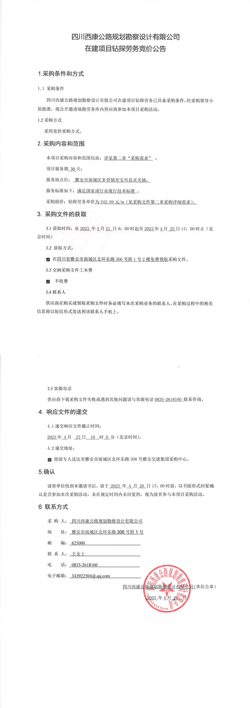 四川西康公路規(guī)劃勘察設(shè)計(jì)公司在建項(xiàng)目鉆探勞務(wù)競價(jià)公告