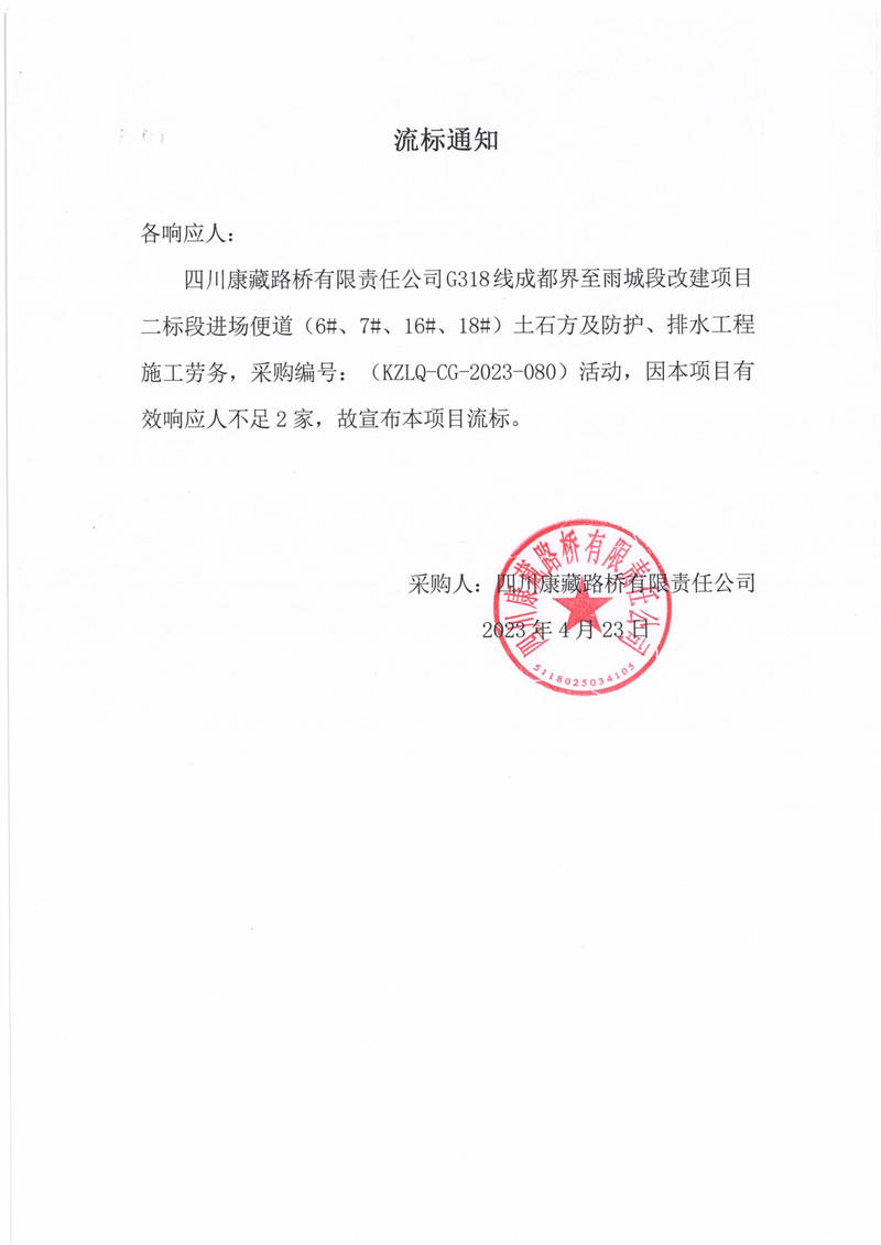 四川康藏路橋有限責(zé)任公司G318線成都至雨城段改建項目二標段進場便道(6#、7#、16#、18#)土石方及防護、排水工程施工勞務(wù)流標通知
